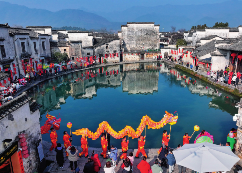 民俗舞龙表演队伍在安徽省黄山市 黟县宏村巡游(2025年2月10日摄) 施亚磊摄