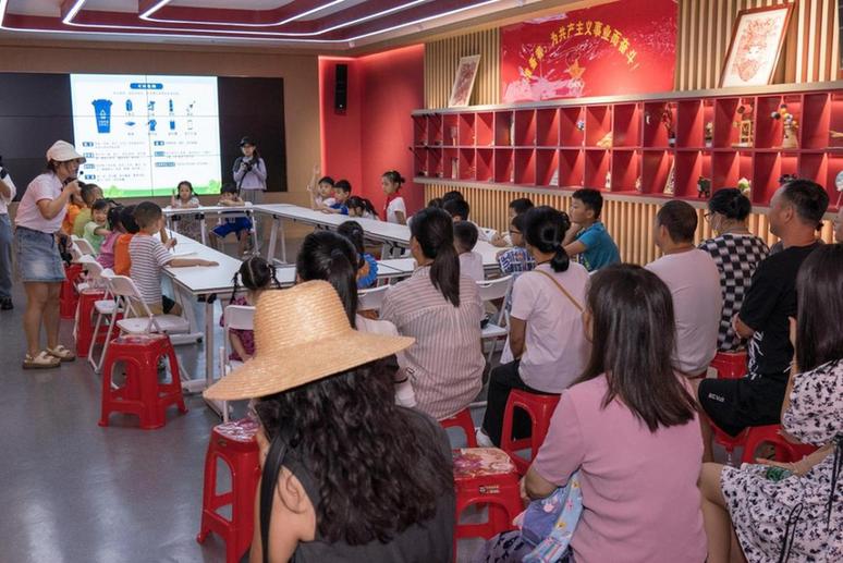 7月16日,湖南省湘西土家族苗族自治州吉首市新时代文明实践中心举办的垃圾分类志愿服务小讲堂,志愿者正在向小朋友们讲述垃圾分类的规则。新华网 钟奕 摄