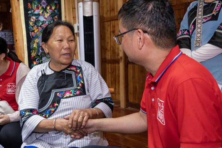 7月16日,湖南省湘西土家族苗族自治州花垣县十八洞村绣娘石顺莲(左)在向新华网记者李洪雷(右)激动地讲述着传统苗绣技艺正在成为当地妇女增收的新途经。新华网 钟奕 摄