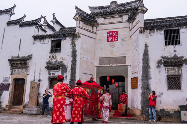 8月31日,在浙江省金华市东阳市湖溪镇镇西村新时代文明实践简约婚礼基地——马上桥花厅,正在举办传统婚礼仪式,倡导年轻人继承传统、简约办婚。新华网 钟奕摄