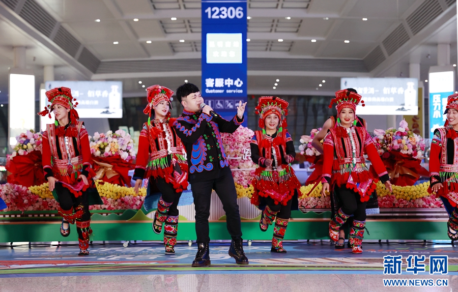 昆明南站出发仪式上的歌舞表演(1月14日摄)。新华网 徐华陵 摄