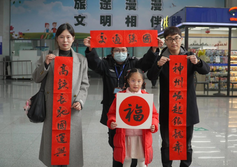 浙江省乐清站开展“新春送对联”活动,为旅客送上带有墨香的“年货”,并现场合影留念。