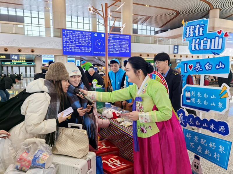 吉林省长白山站内,游客参与车站组织的“趣味问答”活动。