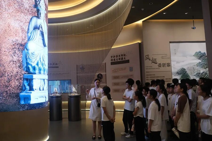学生参观安岳石窟数字展示中心“隐逸山间的佛”主题展区。四川文明网供图