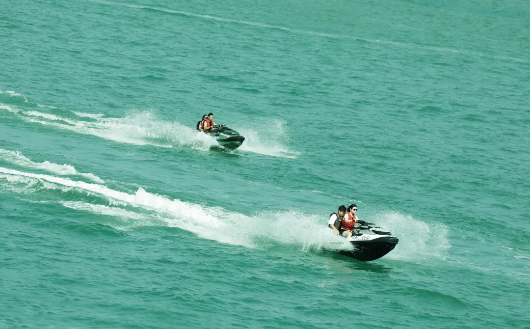 游客在三亚湾碧波荡漾的海面上畅享海上运动