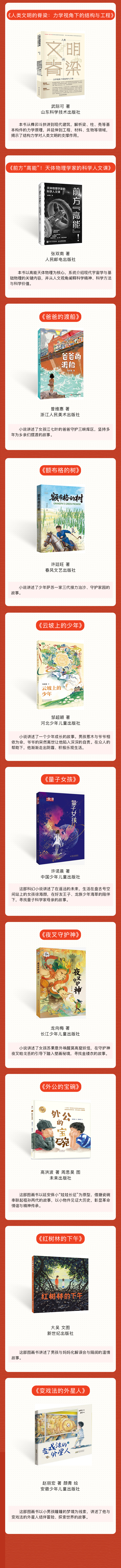 《望山河》《南海:历史与现实》《中国之名 星海之约:给重大科技成果冠上中国名》《大国小农:城市化进程中的农民》《中国早期城市与文明起源》《访古寻踪:文化遗产里的中国》《咸的玩笑》《橘红》《中国画艺术十讲》《王羲之:神采为上》《人类文明的脊梁:力学视角下的结构与工程》《前方“高能”!天体物理学家的科学人文课》《爸爸的渡船》《额布格的树》《云坡上的少年》《量子女孩》《夜叉守护神》《外公的宝碗》《红树林的下午》《变戏法的外星人》入选。(记者:杨湛菲)